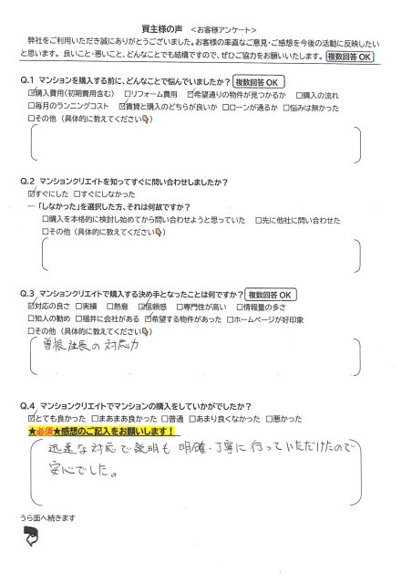 - その都度明確に応対していただき、大変良かったです。売主としては、迷いがありませんでした。